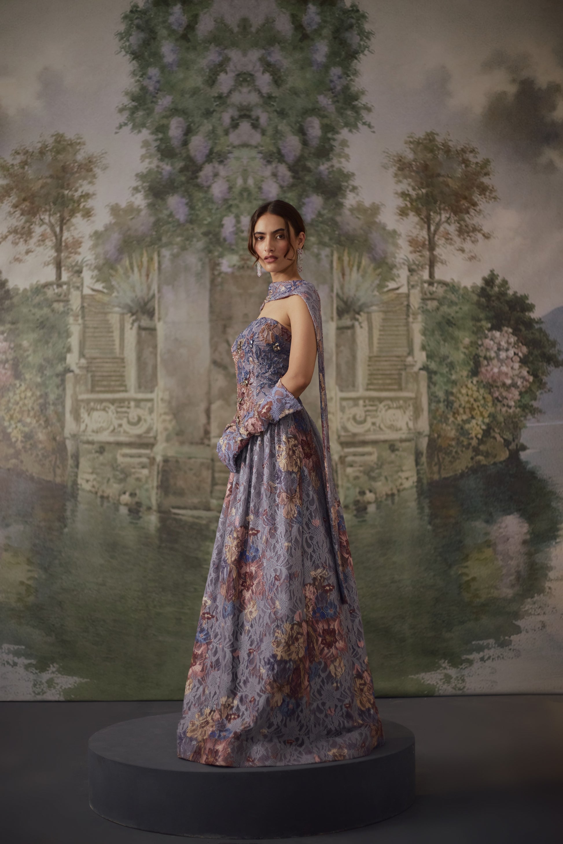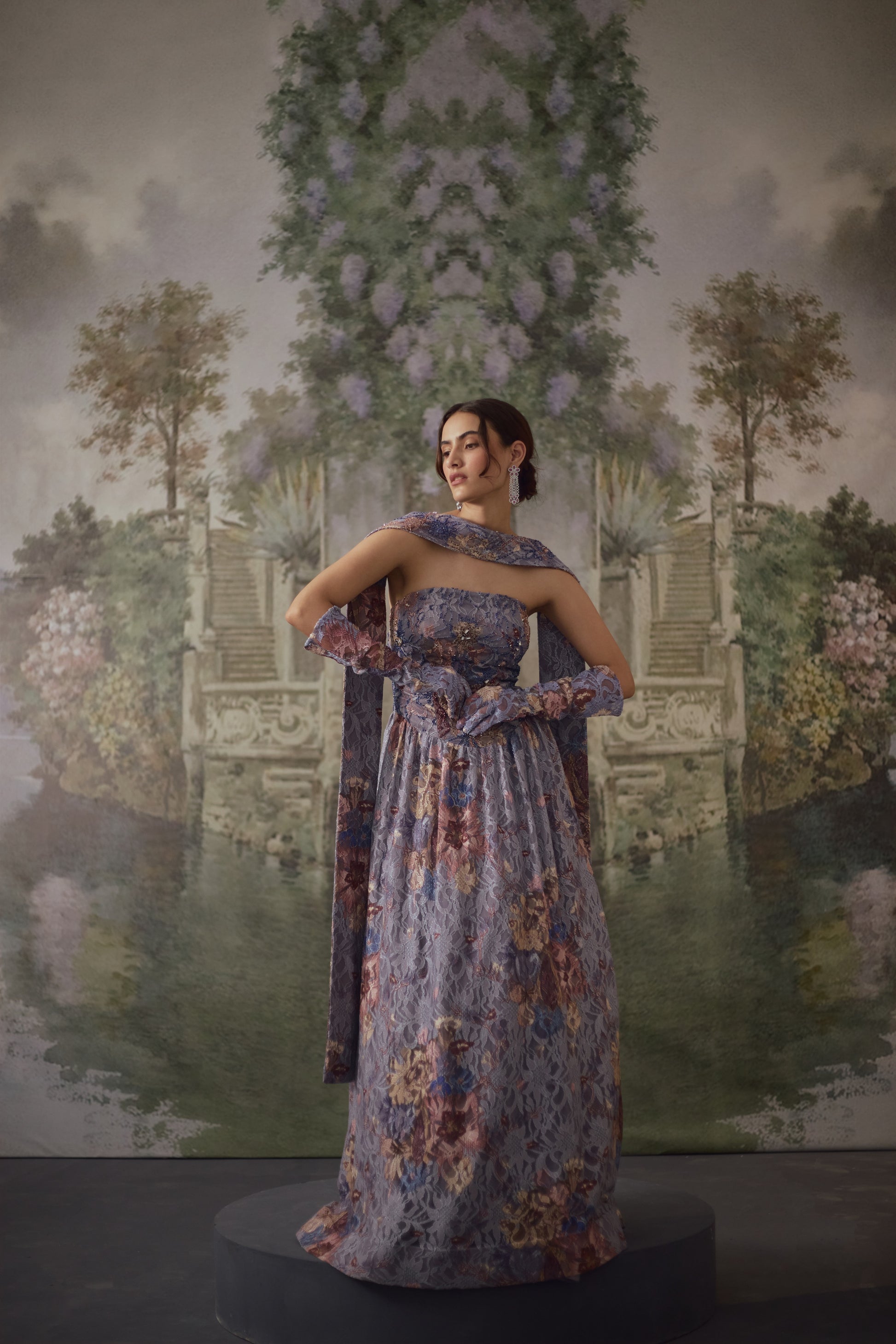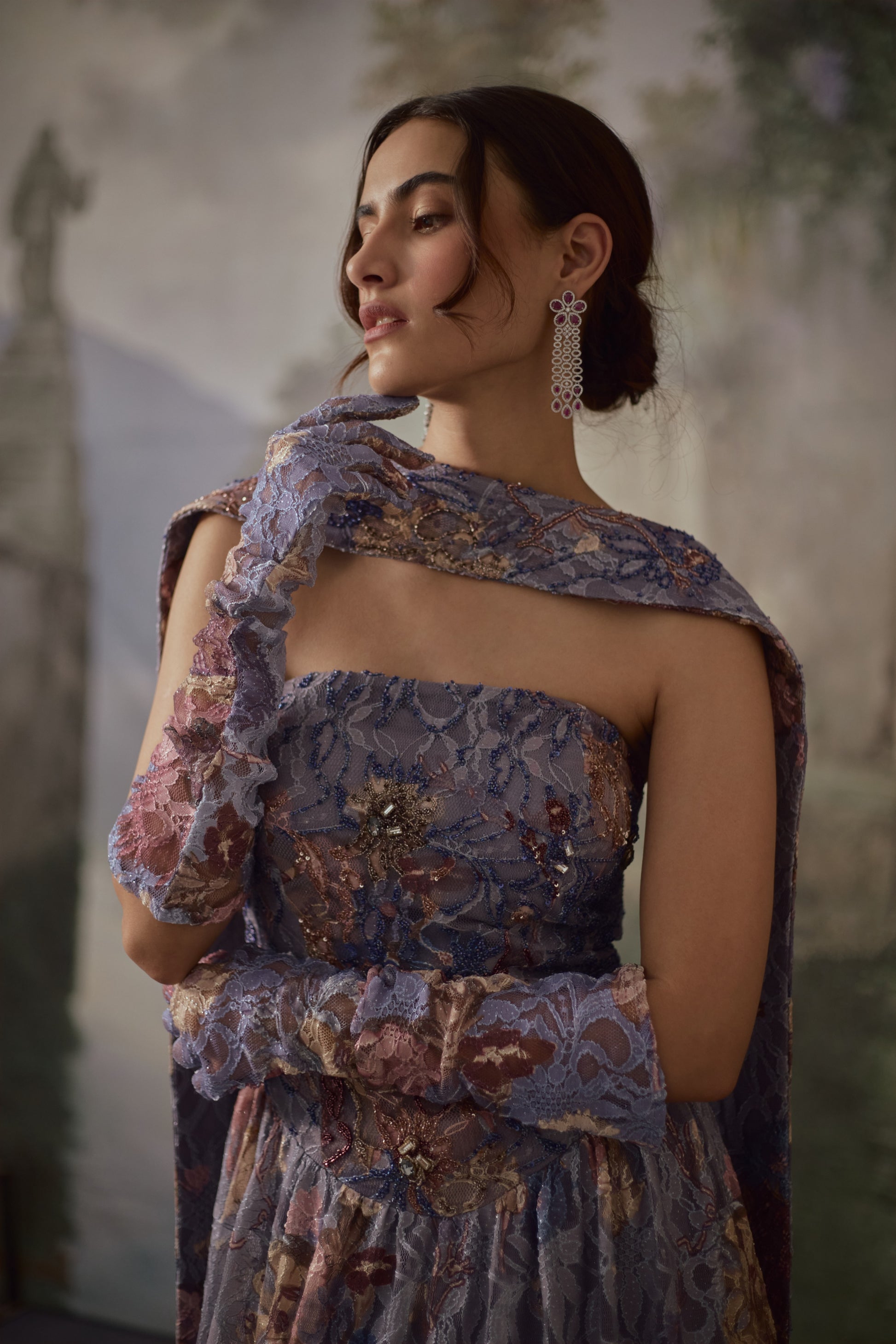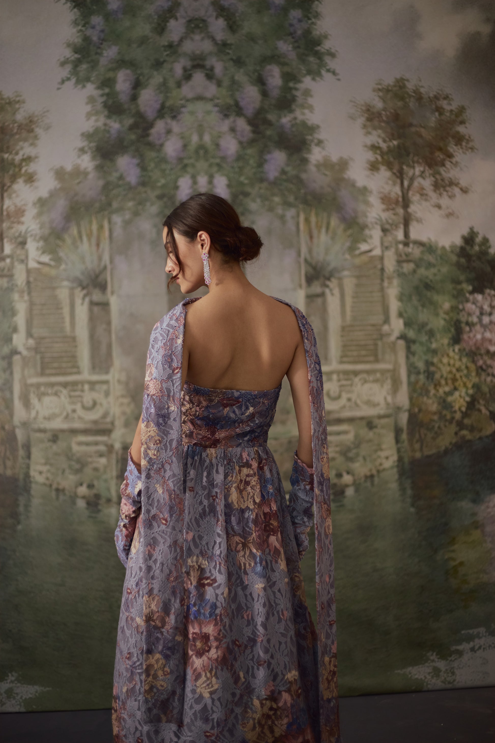 Floral Printed hand embroidered lace dress paired with printed lace hand embroidery scarf.