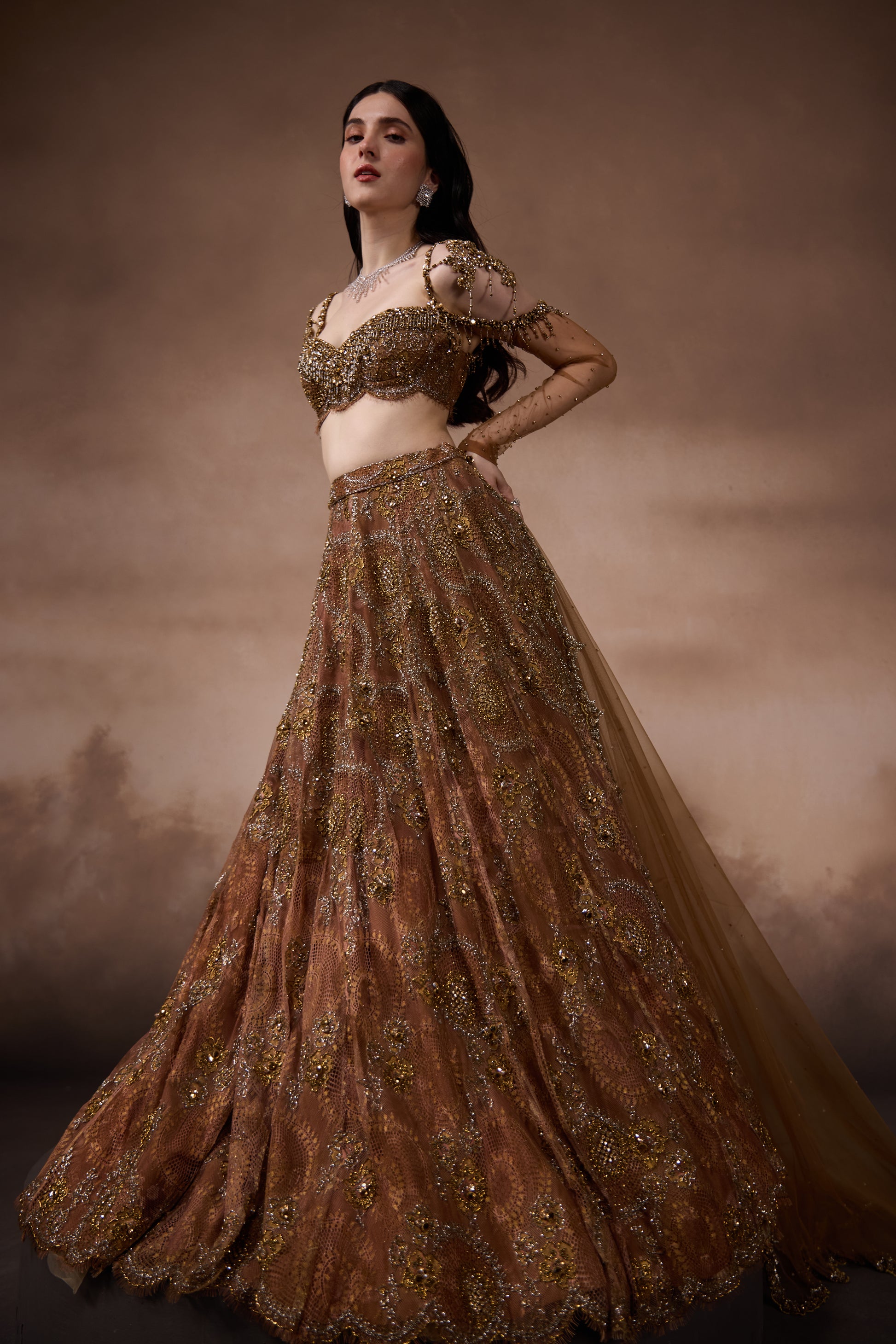 Printed Chantelle Lehenga adorned with delicate stonework, and shimmering embroidery paired with tulle dupatta with cutwork hand-embroidery come together in a vision of ethereal beauty.