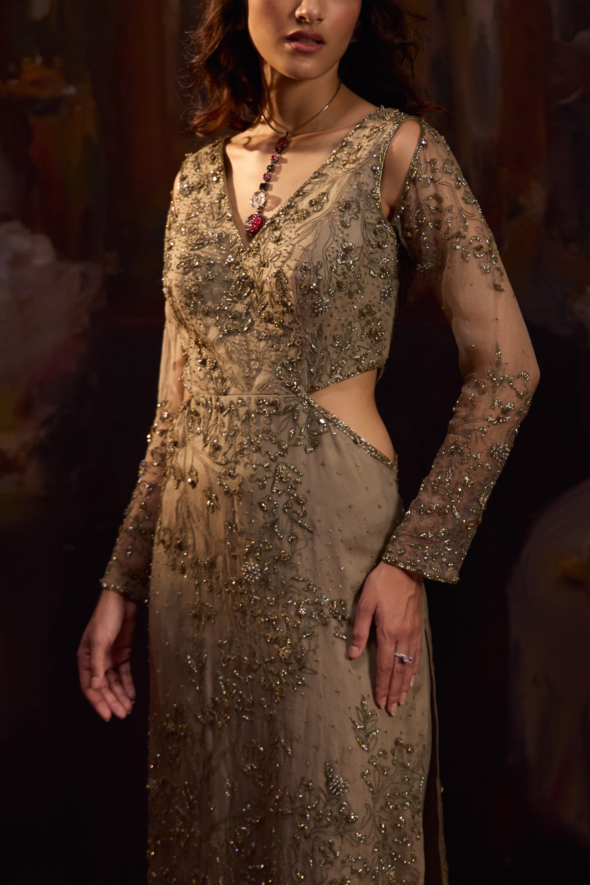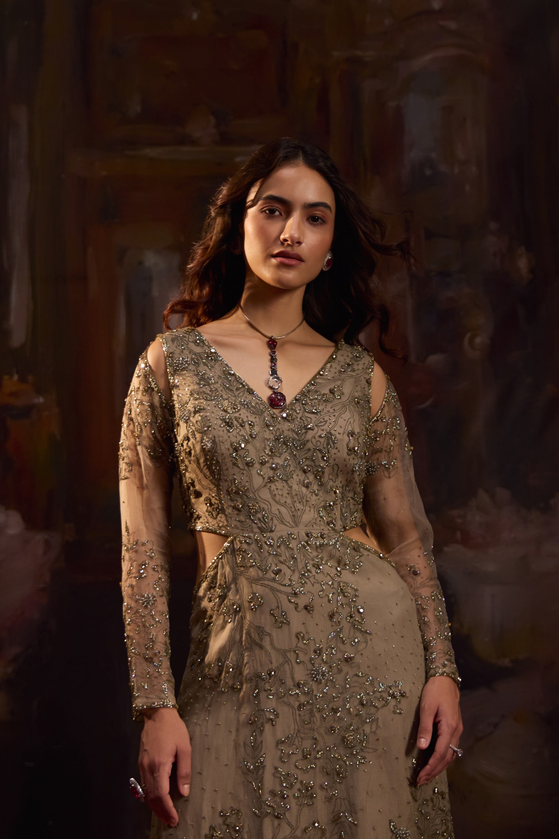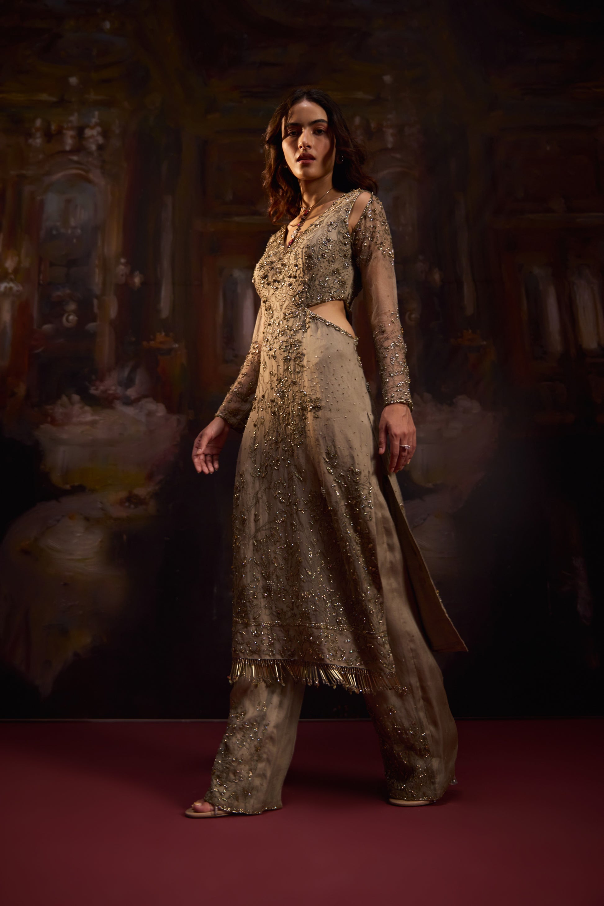 Silk organza hand embroidered shirt paired with silk organza hand embroidered pants.